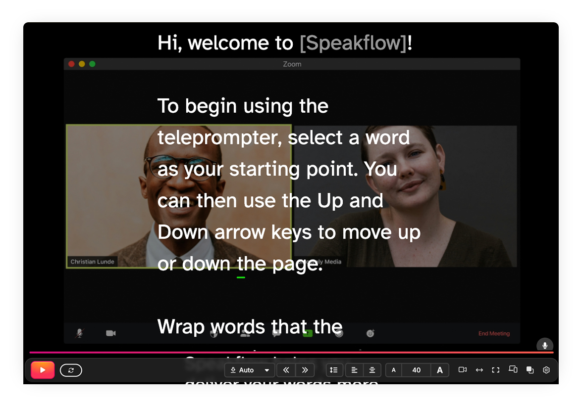 Speakflow's Overlay mode allows you to see other applications underneath your script while you're presenting. This means you can keep an eye on your audience through a video conference platform like Zoom, without having to switch windows or lose your place in your script.