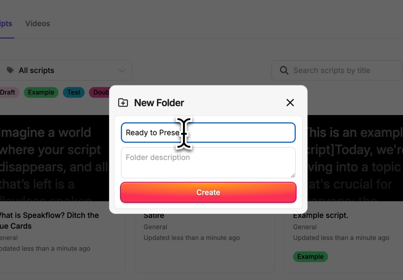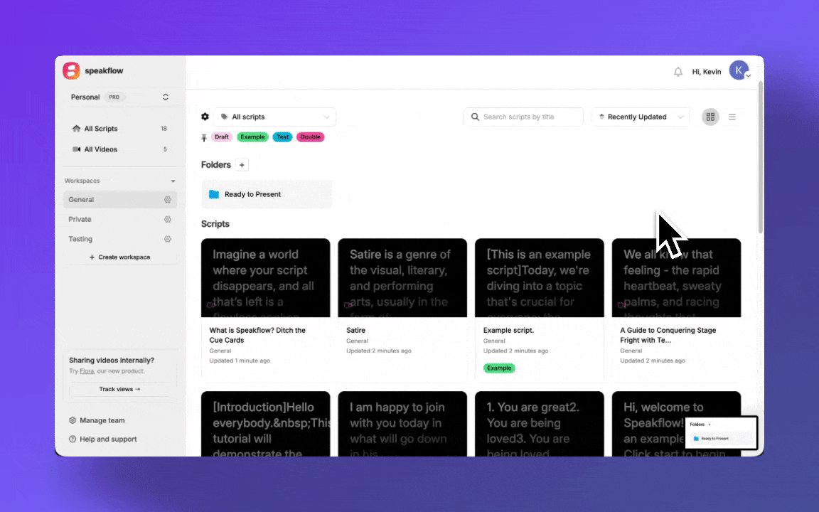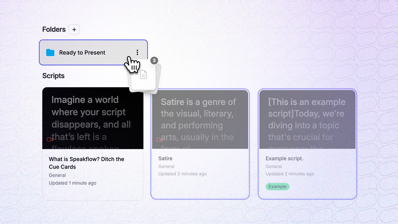 drag-and-drop-folders.png2.45 MB If you've got more than a dozen scripts in Speakflow, you've probably felt the pain. Scrolling through a long list, trying to find that video intro you wrote last month. We did too. So we built something better.