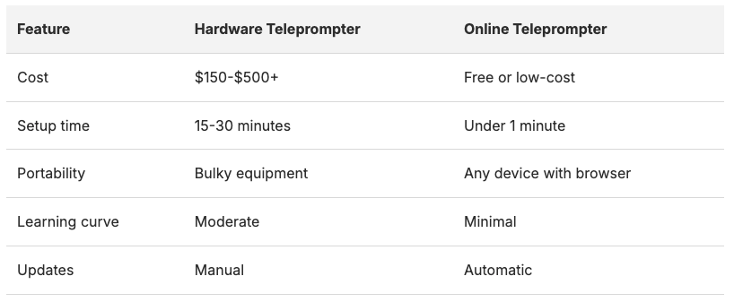 Is a free online teleprompter as good as a hardware teleprompter?