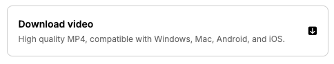 If you have an active subscription and you'd like to download your file in a different format, you can do so by navigating to the Your Videos tab in the script management screen. Screenshot 2024-06-18 at 12.26.15 PM.png57.01 KB Selecting a video from this screen will take you the Watch page where you can preview your video. Recently recorded videos may present you with a message that the video is still processing.Screenshot 2024-06-18 at 12.31.35 PM.png22.5 KBYou can still download your video, but it may take longer than usual. Additionally, the quality of the preview video may be lower than normal. Screenshot 2026-01-21 at 12.43.07 PM.png8.82 KB You can download your video as a .mp4 by clicking on the download button. Your webcam is set to it's highest resolution by default, you can change in the settings menu on the presentation screen.